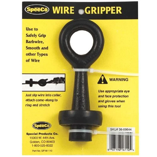 SpeeCo Wire Gripper is an efficient and safe way to hold fence wire in place. Just slip the wire into the collar, attach a come-along to the ring and stretch. It works with barbed wire, smooth wire and small cable.
