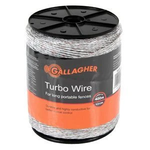 Gallagher Pro 1,312 Ft. (1/4 mi.) Turbo Wire. Best suited to distances more than 1/8 mi. where extreme power is required. Turbo wire resistance is 209 Ohms/mi. 40 times more conductive than standard Polywire. UV-stabilized and strong for longer life. Ultra white, clearly visible to animals.