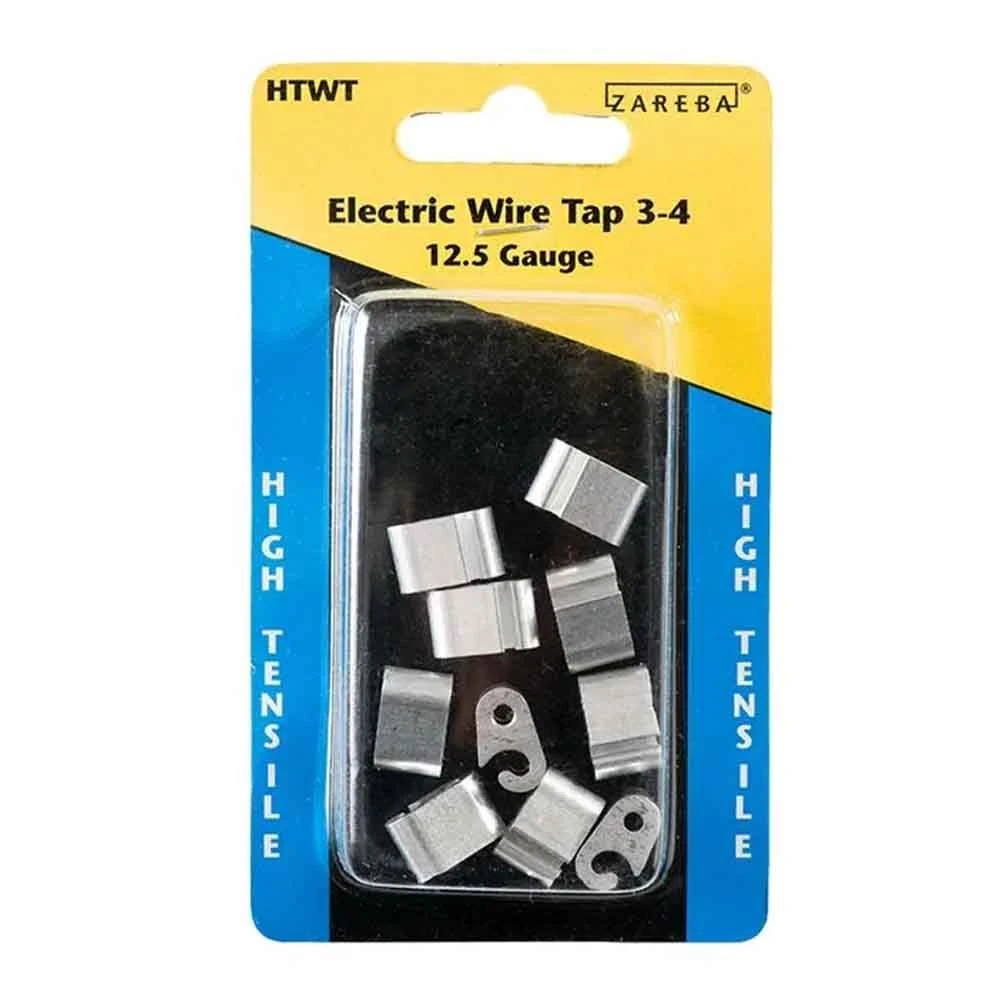 Zareba® Electric Fence Wire Tap electrically connects one fence wire to the next, or hooks up wire to fence wire. It fits 12-1/2 to 16 gauge wire. Crimping tool required; crimp twice for a secure connection. NOTE: Do not use a wire splice.